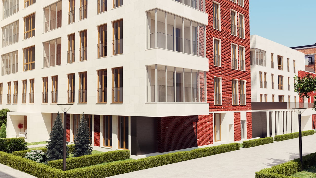 Комплекс прекрасно вписывается в историческое окружение района, гармонично дополняя его. Малоэтажная застройка с небольшими уютными дворами создает ощущение кулуарности и гармонии. Огромные деревянные окна от самого пола выходят на просторную внутреннюю территорию с детской площадкой и ландшафтным дизайном. Территория закрыта от посторонних глаз и сквозного проезда автомобилей. Фасады комплекса решены в стилистике современной классики — кирпич ручной формовки традиционных красных оттенков элегантно сочетается с природным камнем светло-бежевых тонов.